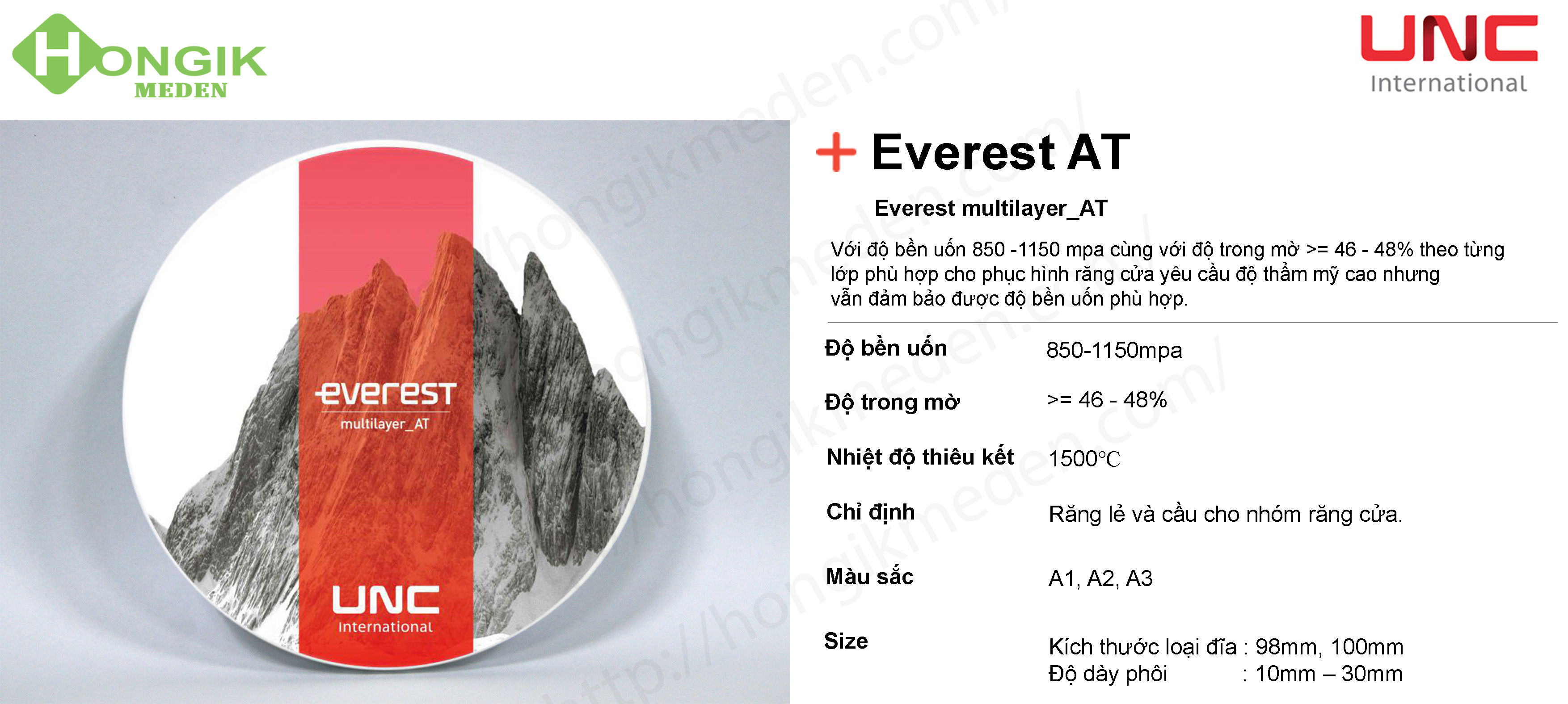 Phôi đa lớp AT Everest Multilayer là sản phẩm của UNC International (Hàn Quốc). Everest AT là phôi Zirconia đa lớp được thiết kế giúp thể hiện được màu sắc đa dạng và độ trong mờ cao của nhóm răng trước. Độ bền uốn tối ưu (850 ~ 1150 MPa theo tiêu chuẩn ISO 6872), phù hợp cho phục hình răng lẻ, cầu dài trên nhóm răng cửa.