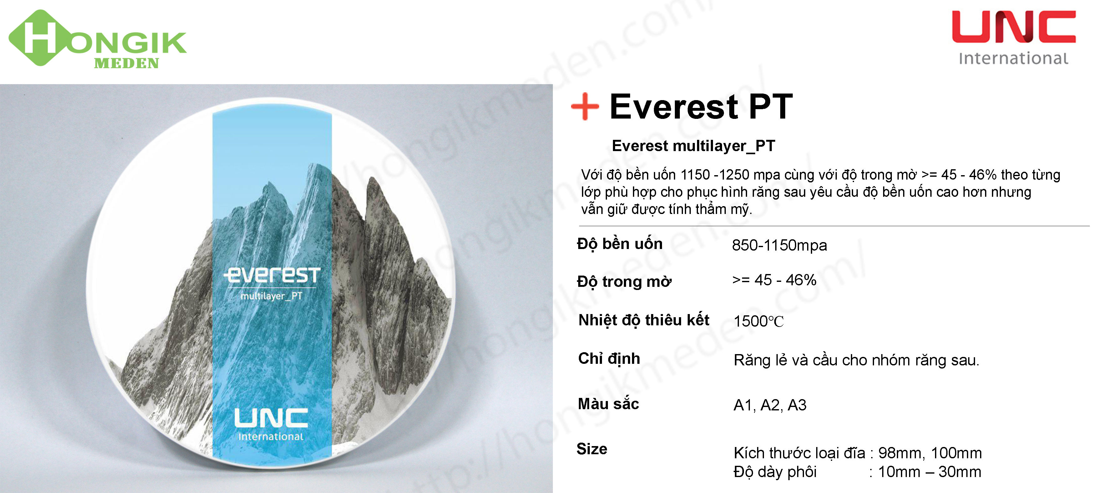 Phôi đa lớp PT Everest Multilayer là sản phẩm của công ty UNC International (Hàn Quốc). Everest PT là phôi Zirconia đa lớp được thiết kế phục hình có được độ chuyển tiếp màu tự nhiên và độ chịu lực cao của nhóm răng sau. Độ bền uốn tối ưu (1150 ~ 1250 MPa theo tiêu chuẩn ISO 6872), phù hợp cho phục hình răng lẻ, cầu dài trên nhóm răng hàm.