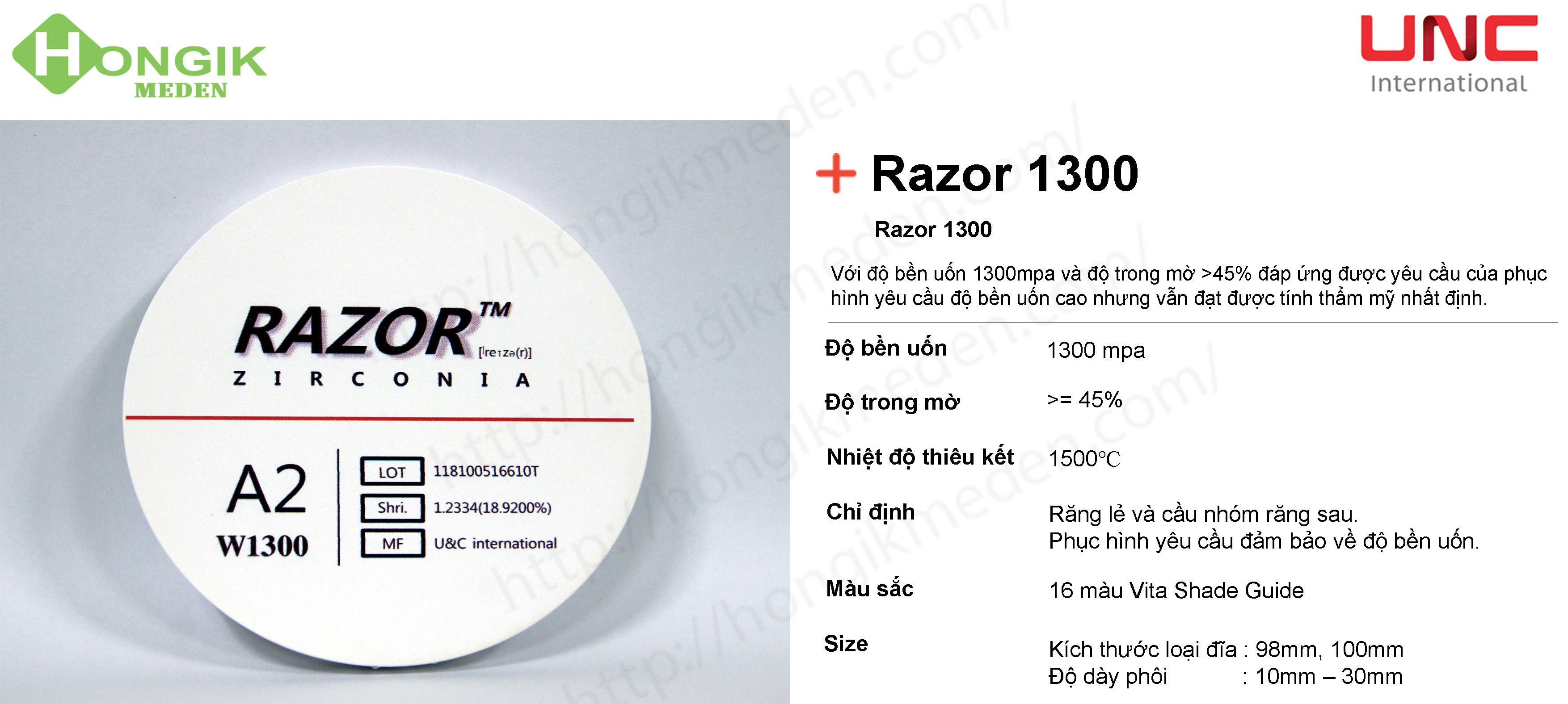 Phôi đục Razor 1300 MPa là phôi Zirconia đơn lớp có độ cứng cao, được phát triển để đảm bảo độ cứng tốt nhất cho phục hình. Phù hợp cho làm sườn phục hình răng lẻ và cầu dài.