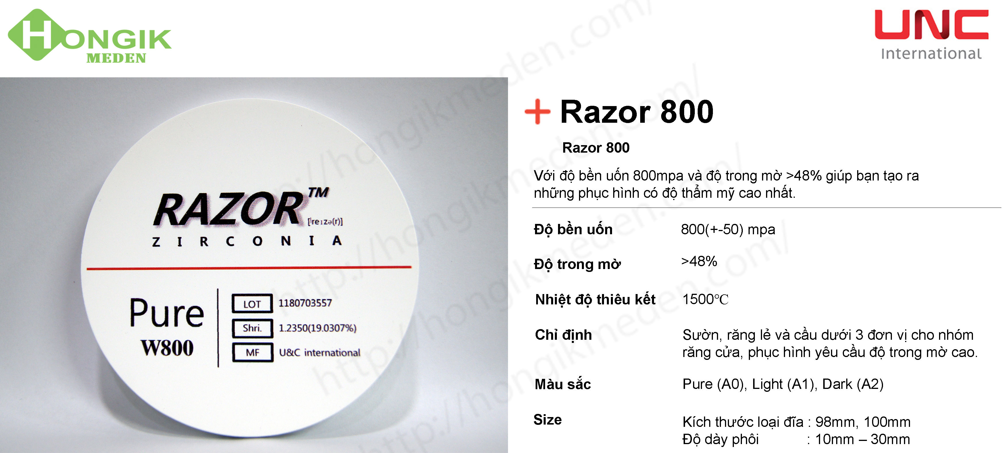 Phôi siêu trong Razor 800 MPa là sản phẩm của công ty UNC International (Hàn Quốc). Được thiết kế để mô phỏng độ trong mờ của nhóm răng trước. Phù hợp cho phục hình răng lẻ và cầu dài trên nhóm răng cửa.